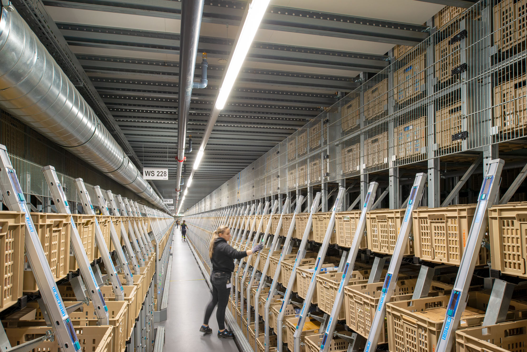 L’area di stoccaggio a temperatura di congelamento comprende una piattaforma multilivello di 4.900 m², installata a una temperatura costante di -4 °C in 17 settimane. La zona a temperatura ambiente include una piattaforma multilivello di 18.000 m², che raggiunge fino a 21 metri di altezza, ed è dotata di scaffalature automatiche per pallet che offrono 10.200 posizioni.